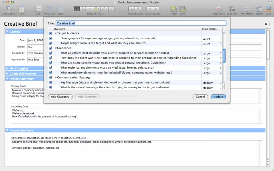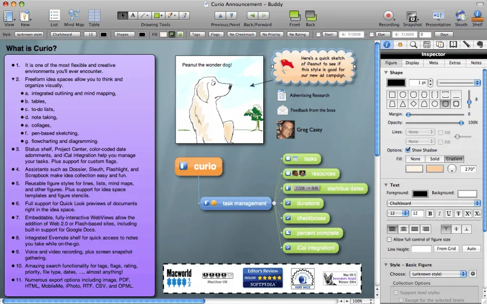 Auf dieses Papier klebe ich geometrische Formen, Textblöcke, Dokumente, Bilder oder Videos, wobei alles nach Gutdünken verschoben und geordnet werden kann. Zusammen mit einer Notizfunktion, To-Do-Listen, Collagen und einer rudimentären Zeichenfunktion erhält man ein sinnvolles Werkzeug, um Ideen zu sammeln, ordnen und darzustellen. An die Komplexität von Tinderbox reicht Curio zwar nicht heran, dafür ist es leichter zu erlernen.