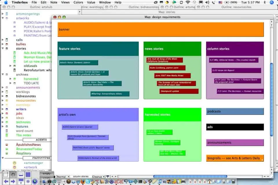 Als Autor und Autorin haben wir zuweilen nur ein vages Bild von der Geschichte, die wir erzählen wollen. Wir wissen anfangs nicht, wie wir unsere Ideen ordnen und miteinander verknüpfen sollen. Genau hier hilft Tinderbox. Im Prinzip dient das Programm als intelligenter Zettelkasten: Wir stopfen all unsere Gedanken unsortiert in »Boxen« (klingt vertraut), und dann helfen fleißige »Agenten«, Ordnung in unser kreatives Chaos zu bringen.