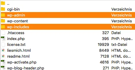 Entpacke die Datei und lade die Ordner „wp-admin“ und „wp-includes“ neu hoch. Ersetze die alten Ordner. Keine Sorge: Diese persönlichen Daten liegen an anderer Stelle. Hier sind nur die reinen WordPress-Daten enthalten.