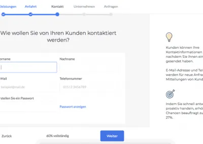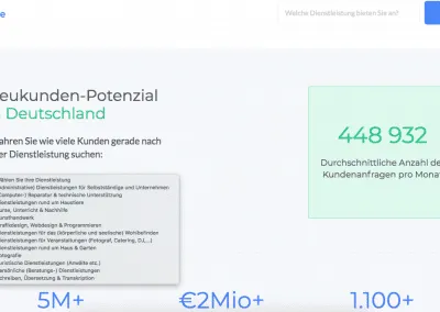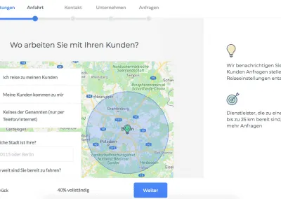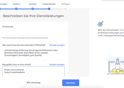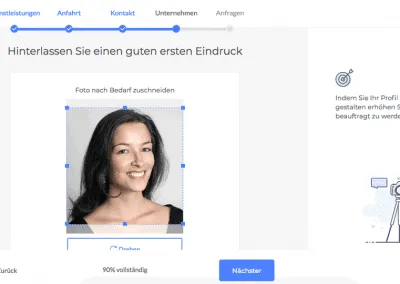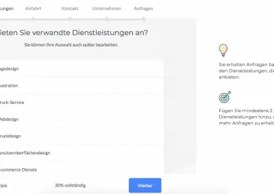 Erstens: Anmelden, um geprüfte Kundenanfragen aus der Region zu erhalten. Es geht also nicht vornehmlich um anonyme Cent-Projekte, die aus den Tiefen des www auf unsere Schreibtische kommen und kaum den Bleistiftanspitzer bezahlen als um „echte“ Anfragen von „echten“ Kunden. Man sogar vorab checken, wie viele Anfragen es in deinem Bereich zur Zeit gibt. Wenn man sein Profil eingerichtet hat, Name, Bild, Ort, USP, etc., geht es los. Hilfreich sind auch Links zu Kundenbewertungen. Je mehr Referenzen desto besser für die Quantität und Qualität der Anfragen.