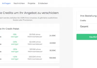 Zweitens: Wenn eine Kundenanfrage reinkommt, die spannend, klingt, nutzt man seine Credits, die man vorher allerdings im Paket kaufen muss, es gibt verschiedene Preismodelle, um sein Angebot abzugeben. Der Kunde enthält dann eine Nachricht in deinem Namen.