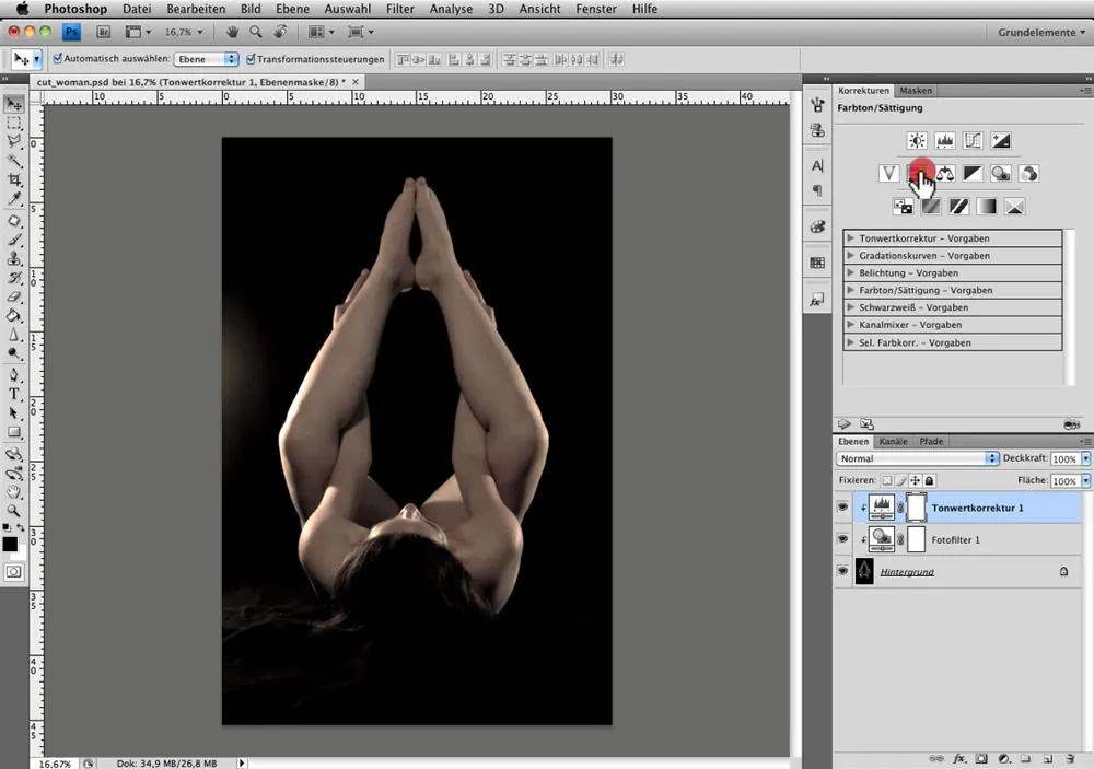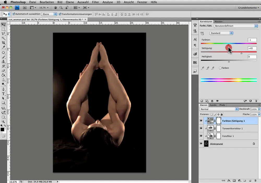 Mit den Korrekturen Farbton / Sättigung und Tonwertkorrektur lassen sich die kopierten Hautteile gut angleichen.
