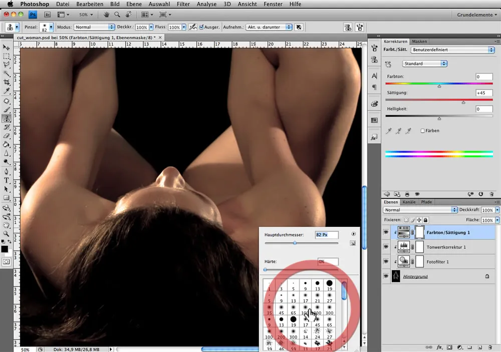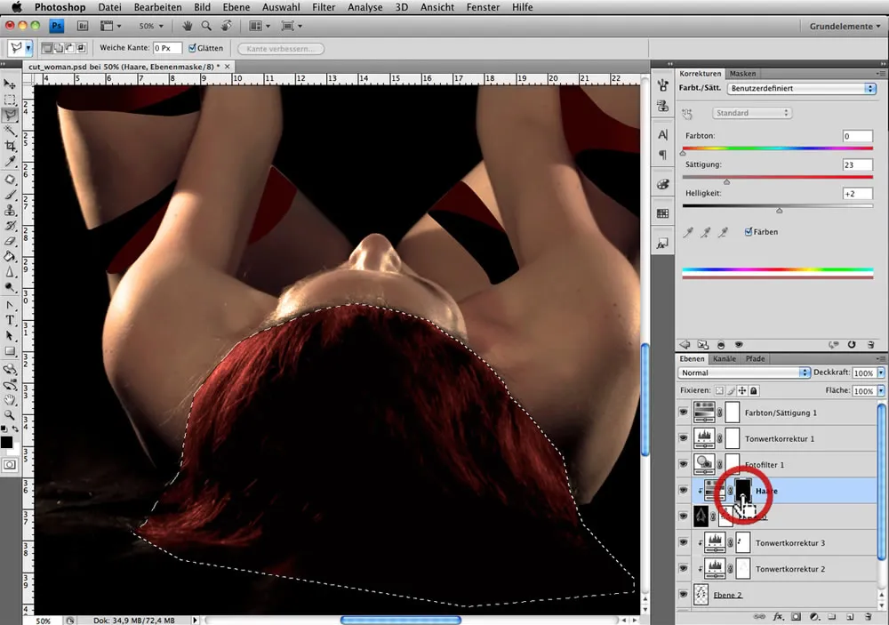 Bei aktiver Maske wählen wir die Korrekturebene Farbton/Sättigung und färben unsere Haare – in diesem Fall Rot.