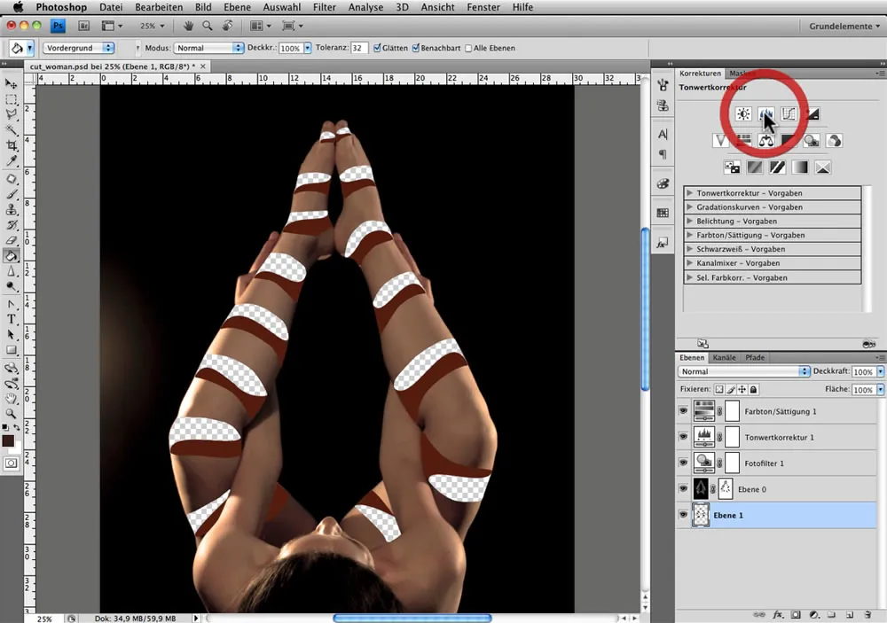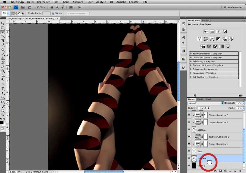 Maskiert nun Stellen der beiden Tonwertkorrekturen „Tiefen“ und „Höhen“ entgegen dem Lichteinfall auf der Oberseite der Beine: