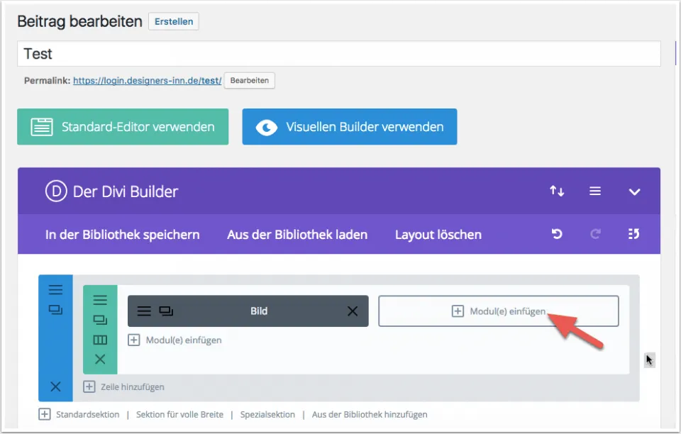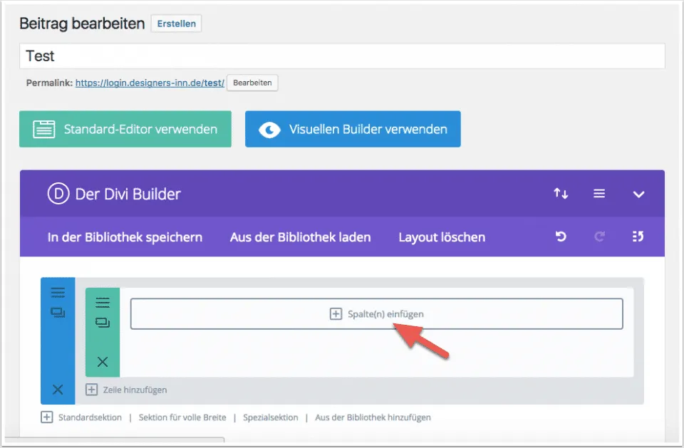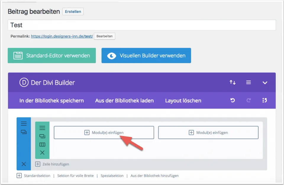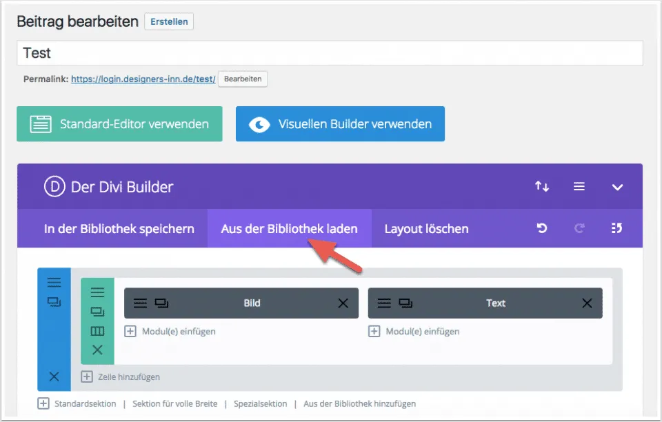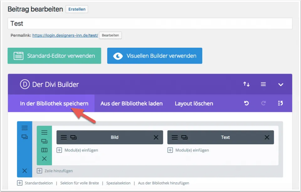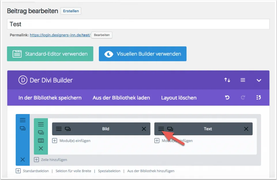 Das Herzstück des Themes ist der sogenannte Pagebuilder. Mit diesem kannst du alle Elemente der Website bequem per Drag and Drop bearbeiten. Sobald du eine Seite oder einen Beitrag öffnest, hast du jetzt einen weiteren Button zur Verfügung: „Den Divi-Builder benutzen“.
