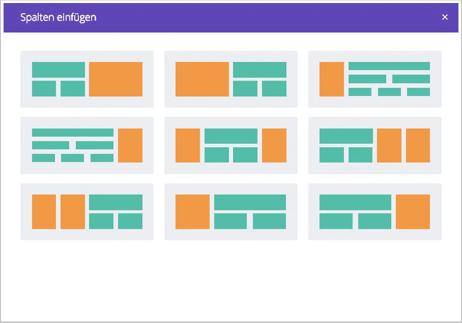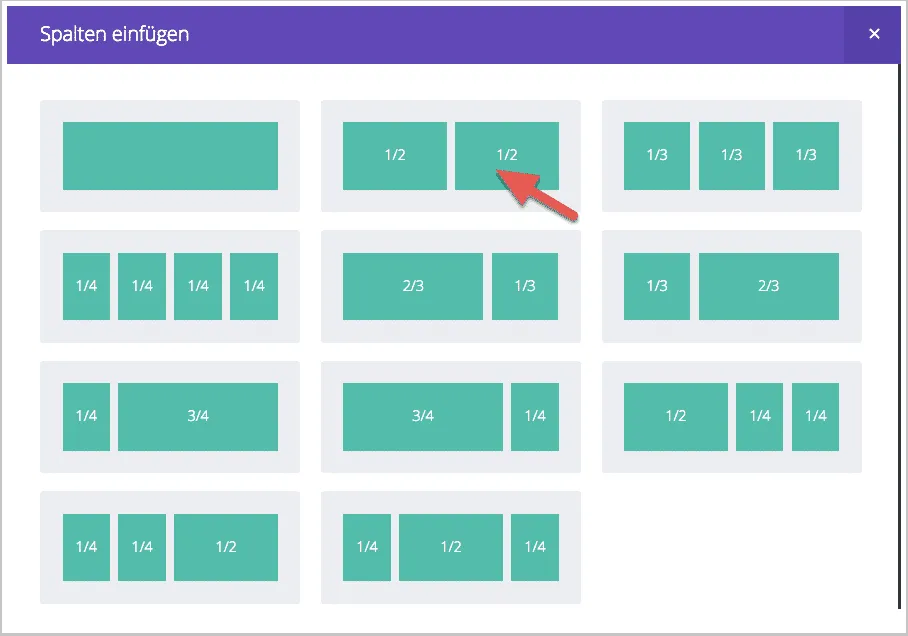 - Spalten festlegen: Die Sektion teilst du dann in Spalten auf (Grüne Zeile). Man kann zwischen 1:2 bis 1:4 jede Kombination wählen.