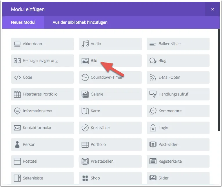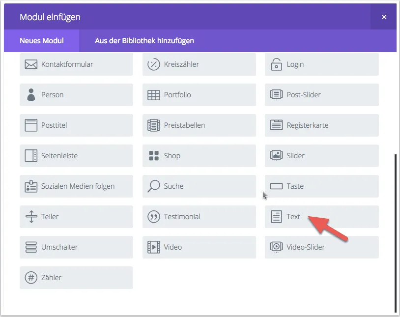 - Modul auswählen: Jetzt wählst du für die jeweilige Spalte ein Modul aus. Klickst du auf Module, öffnet sich ein Fenster mit allen zur Verfügung stehenden Modulen (Text, Bild, Video, Galerie, Slider, etc.).