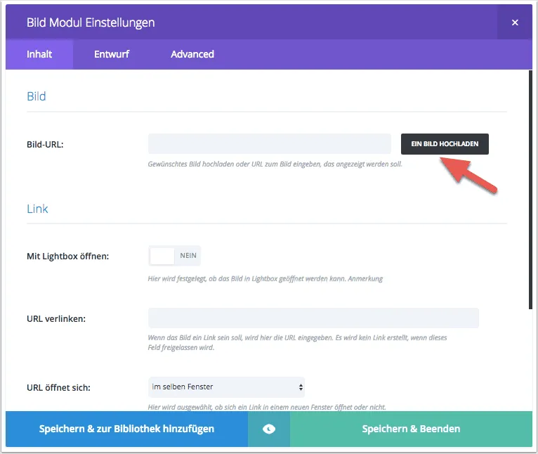 Nun bekommst du alle Einstellungsmöglichkeiten für Bilder. Hier wähle „Bild hochladen“. Darüber kommst du zu deiner Mediathek bzw. kannst ein neues Bild hochladen.