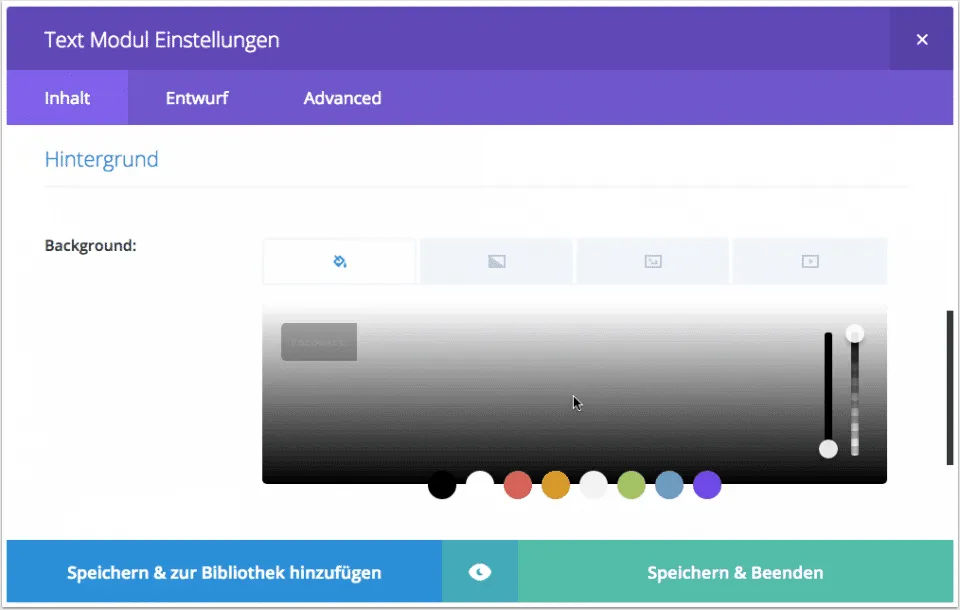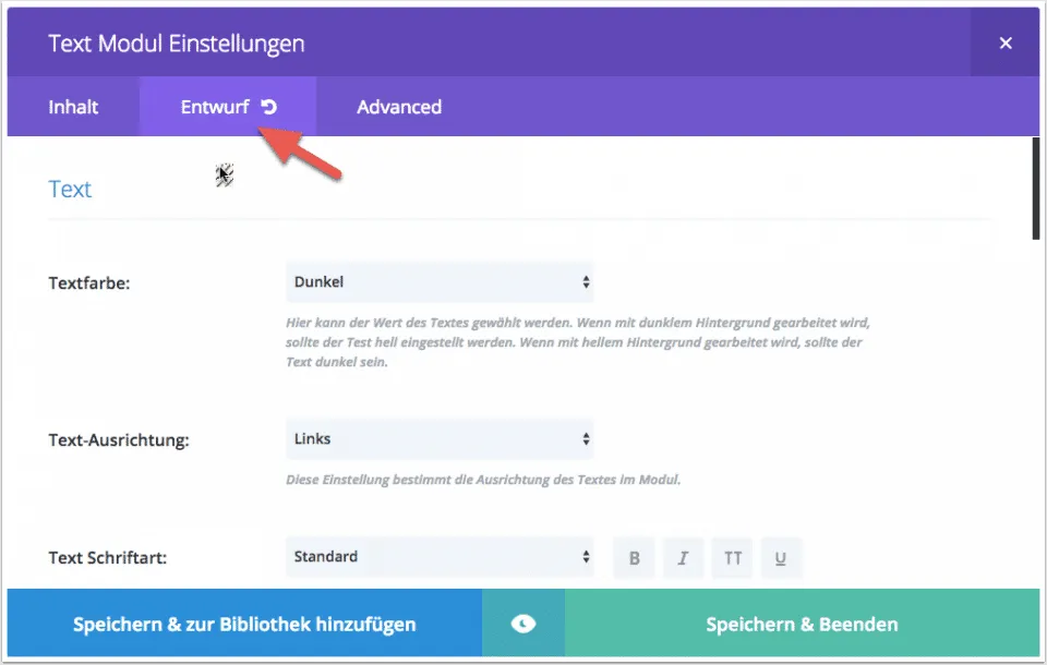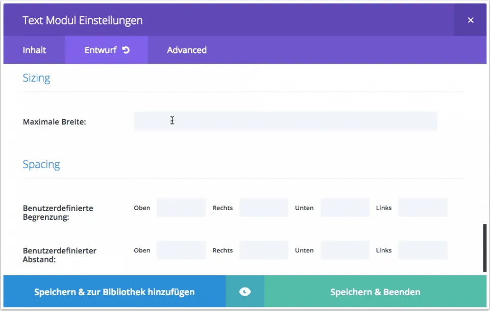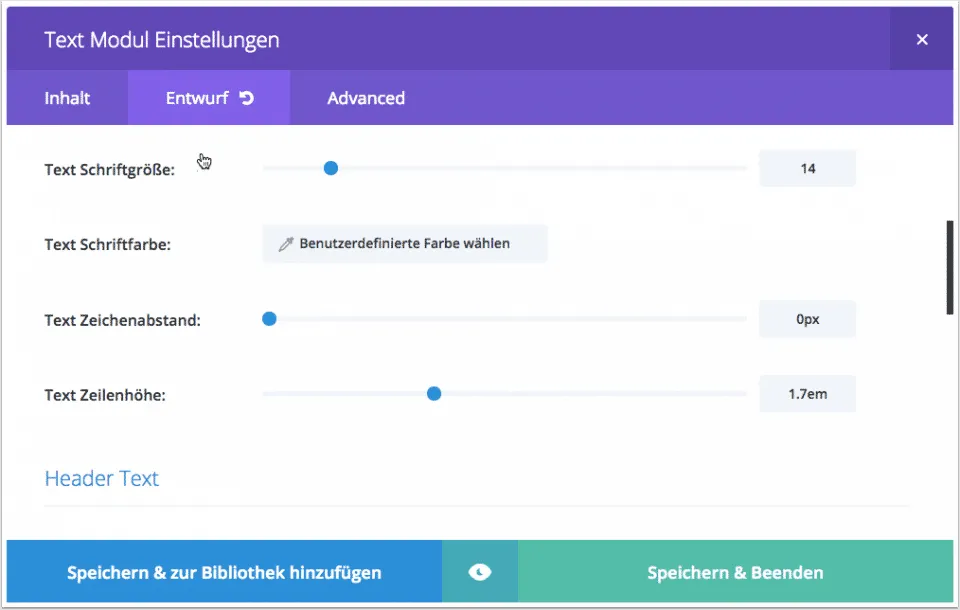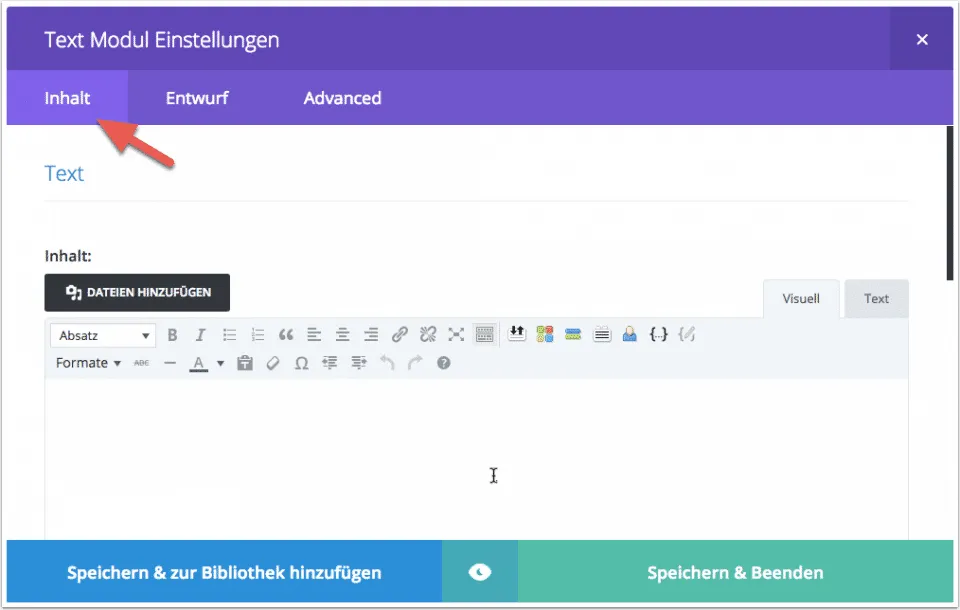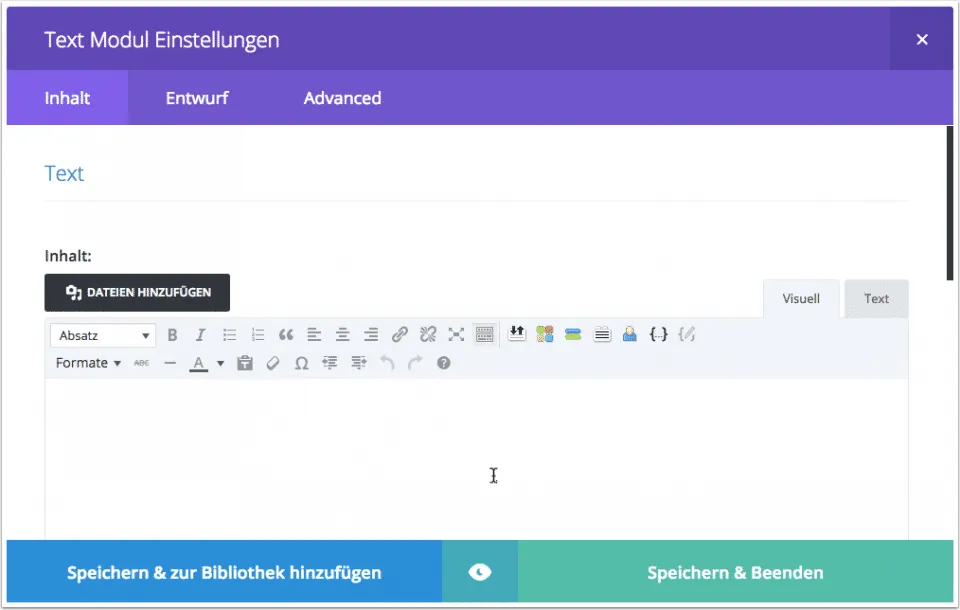 Der Grundaufbau ist bei jedem Modul gleich. Es gibt drei Seiten: Inhalt, Entwurf, Advanced (Erweitert). Alle wichtigen Inhalte fügt man – logisch – auf der Seite „Inhalt“ ein. Bei dem Modul Text ist dies natürlich dein Text.