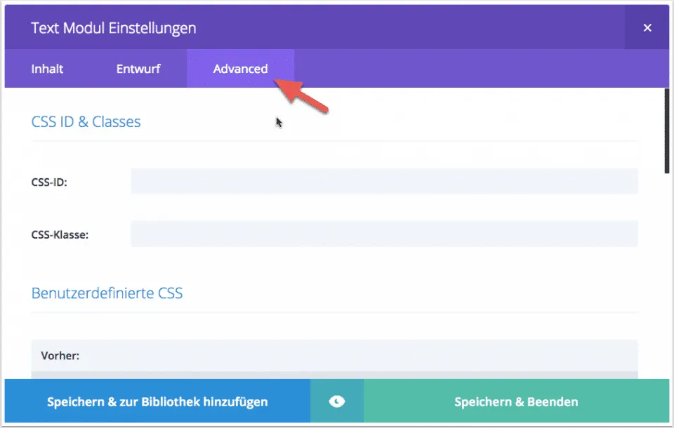 Der letzte Abschnitt „Advanced“ ist in der Tat für Fortgeschrittene gedacht. Hier kann man alle Elemente individuell per CSS anpassen. Zudem lassen sich hier IDS und Klassen vergeben.