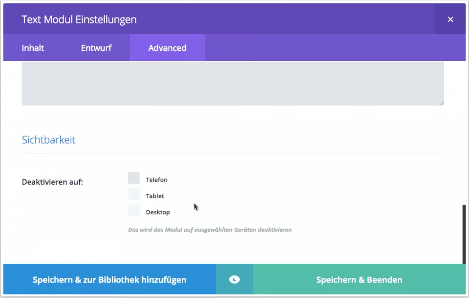 Für den normalen Anwender ist hier jedoch auch etwas spannendes zu finden. Denn ganz unten auf der Seite lässt sich festlegen, auf welchem Endgerät (Desktop, Tablet, Handy) das Modul aktiv sein soll. Ich nutze dies Funktion zum Beispiel gerne, um einzelnen Elemente für die mobile Ansicht zu deaktivieren.