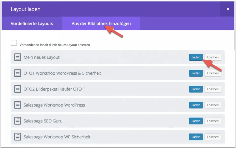 Ein guter Weg für den Entwurf neuer Seiten sind die vorgefertigten Layout. Über Designers Inn hast du Zugriff auf weit über Hundert professionellen Vorlagen, die alle gängigen Seitentypen abdecken, wie zB „Über uns“, „Kontakt“, „Blog“, „Portfolio“ usw. Du kannst die Layouts über deine Bibliothek laden.