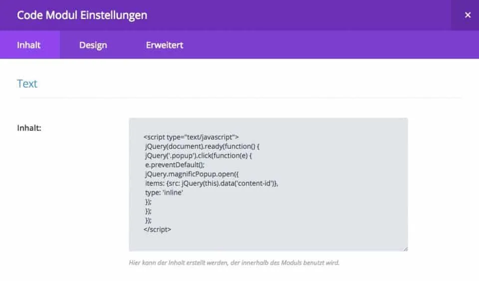 Nun wird es etwas komplizierter. Wir wollen ein Seitenelemente (Sektion, Zeile oder ein einzelnes Modul) in einer Lightbox öffnen. In meinem Beispiel möchte ich ein Textmodul öffnen.