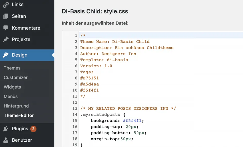 Nachdem ich nun alles in einzelne Klassen gepackt habe, können wir auch alle Elemente formatieren. Gehe also in dein WordPress-Dashboard zu deinem Theme > zu deinem Theme-Editor > zur Datei style.css