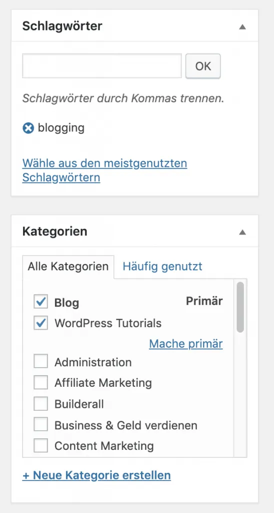Perfekt. Geschafft. Damit werden nun die ähnlichen Beiträge passend zu den Tags in deinem Beitrag ausgegeben. Denke daran, dass du auch Tags/Schlagwörter vergeben musst, damit etwas angezeigt werden kann. Die Schlagwörter legst du ebenso wie Kategorie direkt in deinem Artikel fest: