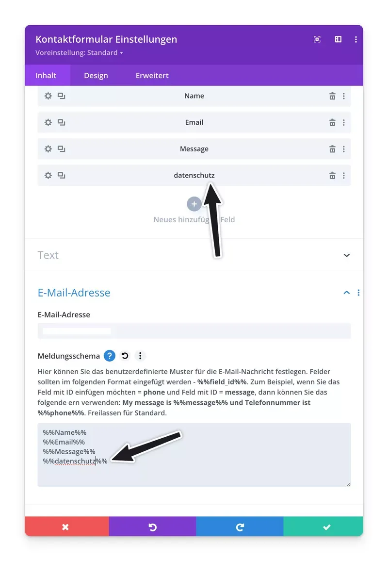 datenschutzzu vergeben. - Passe das Nachrichtenmuster/Meldungsschema an: Öffne die Einstellungen des Kontaktformulars im Divi Builder und gehe zum Tab "Nachrichtenmuster/Meldungsschema". Füge dort das oben genannte Nachrichtenmuster ein.