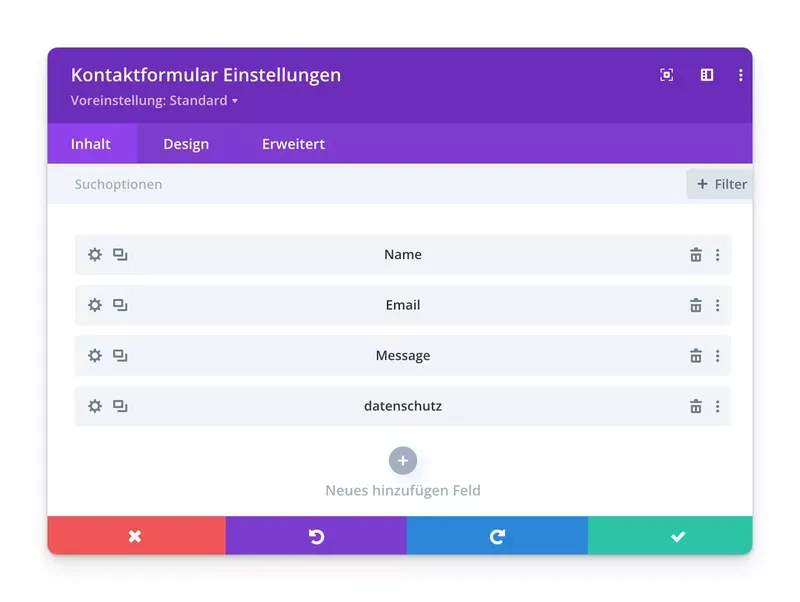 - Füge die Standardfelder hinzu: Gehe in den Divi Builder und füge die Standardfelder für Name, E-Mail-Adresse und Nachricht hinzu.