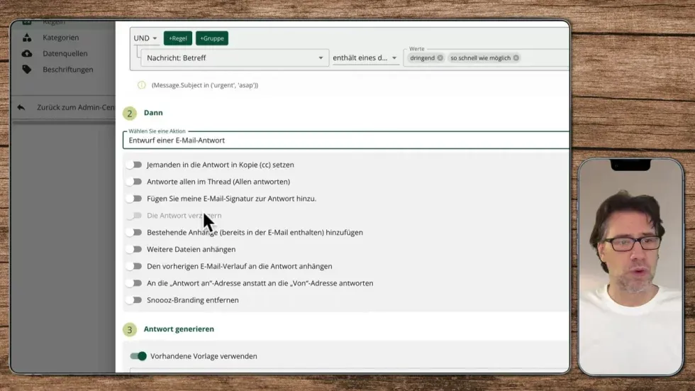 Eine Regel ist nie perfekt beim ersten Versuch. Snoooz hat eine praktische Testfunktion: Du kannst eine Fake-Mail erstellen und sehen, was passiert. Teste verschiedene Szenarien. Arbeite iterativ. Lies die generierten Entwürfe, passe Templates an, verfeinere Bedingungen. Wir haben so lange gefeilt, bis die KI-Antworten wie von uns formuliert klangen.