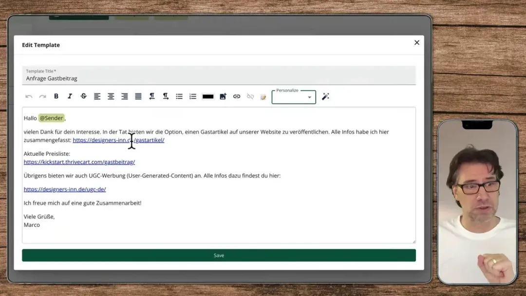 Du kannst Templates erstellen und Variablen wie Sender-Name, Recipient oder Booking-Link einfügen. Ich habe eine Vorlage für Gastbeiträge: