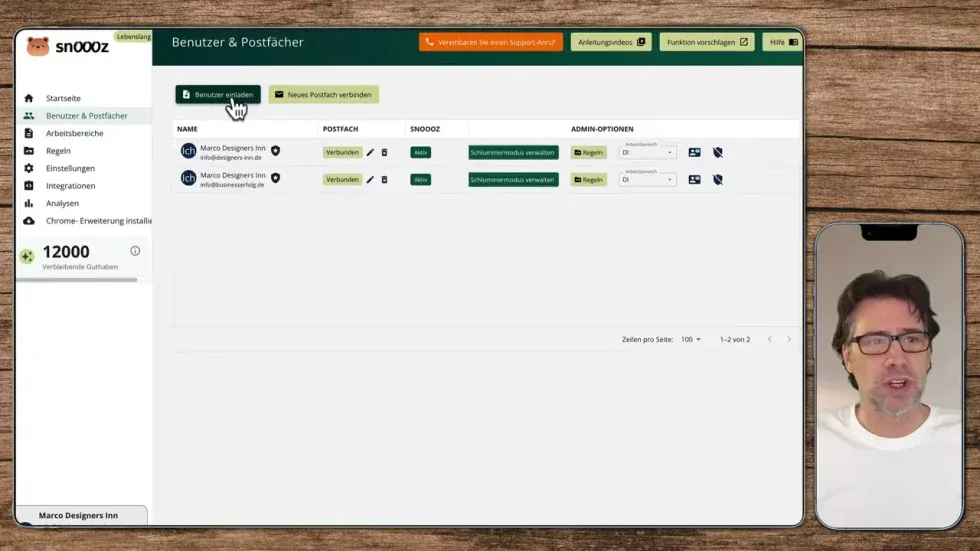 Das Setup ist erstaunlich simpel. Du legst Benutzer an und verbindest Postfächer. Snoooz unterstützt Gmail, Outlook und per IMAP fast jedes andere Postfach.