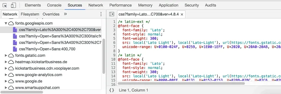 Gehe nun auf den Punkt Source (Chrome) bzw. Netzwerkanalyse (Firefox) und aktualisiere die Seite. Bei meiner Seite wird nun „fonts.googleapis.com“ aufgelistet. Klicke ich hier drauf, sehe ich, dass die Schrift „Lato“ und „Open Sans“ von Google geladen wird.