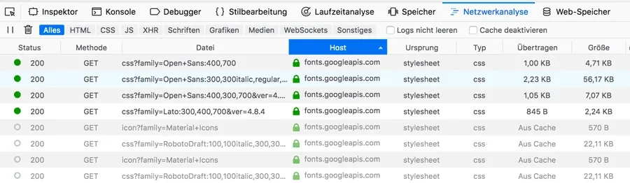 Bei Firefox sehe ich das gleiche Ergebnis in der Netzwerkanalyse. Hier sortierst du das Ergebnis nach HOST und suchst nach „fonts.googleapis.com“. Auch hier sehe ich, dass „Open Sans“ und „Lato“ geladen werden.