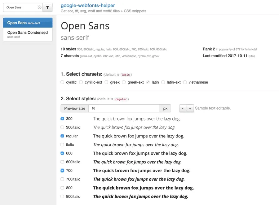 Der einfachste Weg, an all diese Schriften zu kommen ist, den Dienst von Herokuapp zu nutzen. Klicke einfach auf folgenden Link: https://google-webfonts-helper.herokuapp.com/fonts