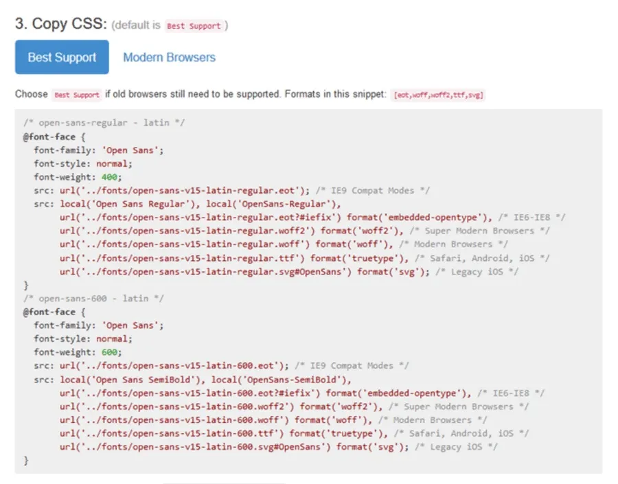 Sobald du deine Schrift zusammengestellt hast, gehst du weiter zum Punkt: Copy CSS. Ich empfehle dir die Standardeinstellung zu nutzen (Best Support). Du kannst auch „nur“ Schriften für moderne Browser nutzen, dies schränkt aber die Kompatibilität deiner Website ein. Klicke also auf „Best Support“ und kopiere den gesamten Text (im grau hinterlegten Feld).