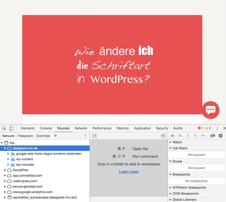 Im ersten Schritt musst du prüfen, welche Schriften du derzeit nutzt. Im einfachsten Fall sind die Schriften global über dein Theme festgelegt. Es kann aber auch sein, dass Plugins besondere Schriften benötigen. Einen guten Überblick bietet dir die Browserkonsole von Chrome oder Firefox. Hier kannst du sehen, ob du überhaupt Schriften von Google lädst – und wenn ja, dann welche Schriften geladen werden.