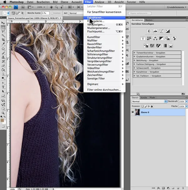Das Freistellen von Haaren ist sicher eine der Königsdisziplinen im Berufsalltag des Designers. Insbesondere „Locken“ sind eine wirkliche Herausforderung. In diesem Workshop zeige ich, wie man mit wenigen Schritten Haare professionell freistellen kann – ohne einen lustigen Scherenschnitt zu erhalten. Die verwendeten Techniken funktionieren seit Photoshop 6. Unter anderem benötigen wir den Filter „Extrahieren“. Seit Photoshop CS4 wurde dieser Filter leider aus dem Programm genommen. Allerdings bietet Adobe das Plug-Inn zum kostenlosen Download an. Natürlich findet ihr im Tutorial die entsprechenden Links zum Download für Windows und MacOS.