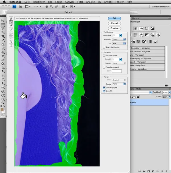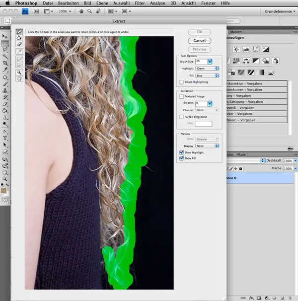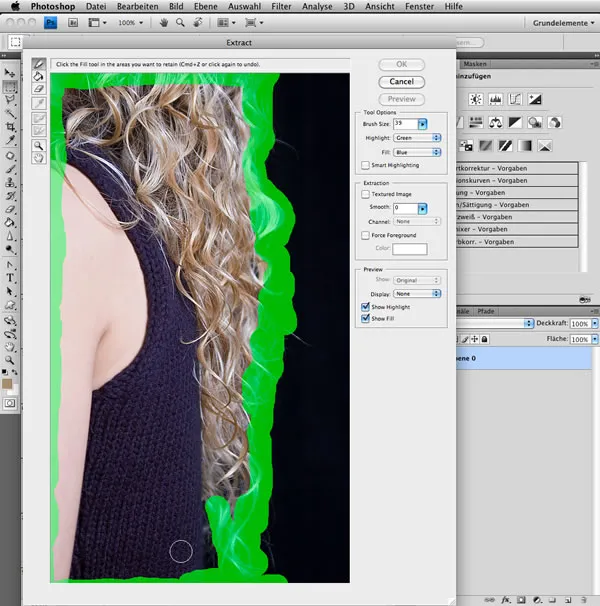 Wir bekommen ein neues Bearbeitungsfenster. Hier überpinseln wir mit dem Kantenmarker die Haarkante. Die markierten Stellen werden grün angezeigt.