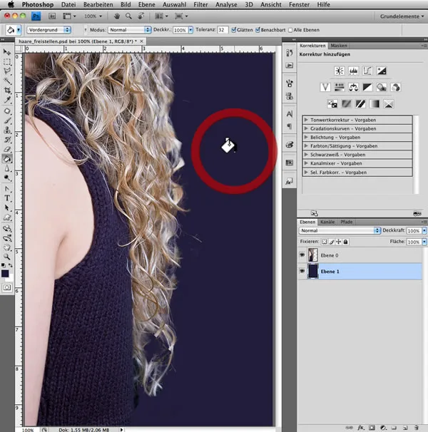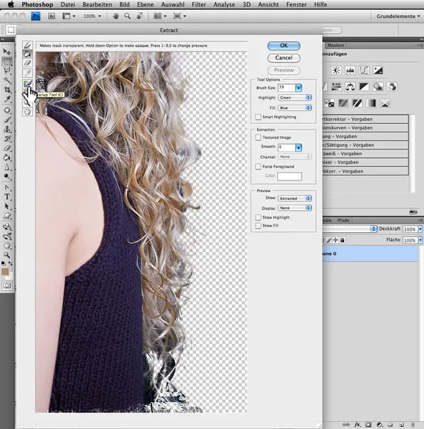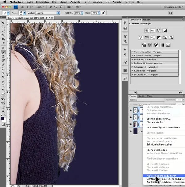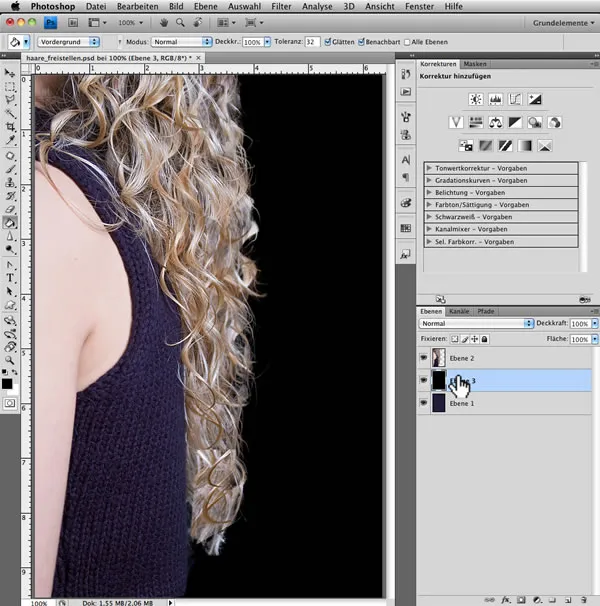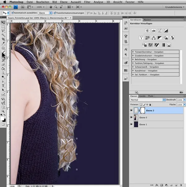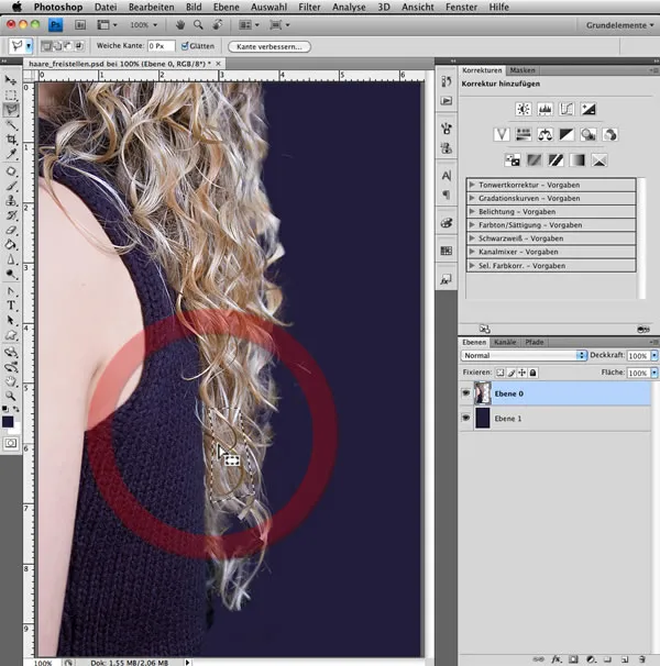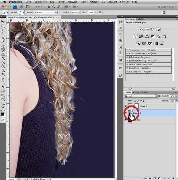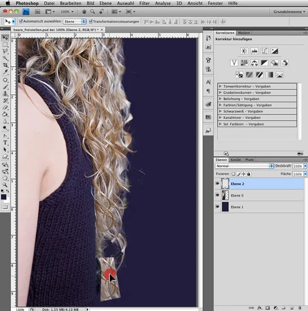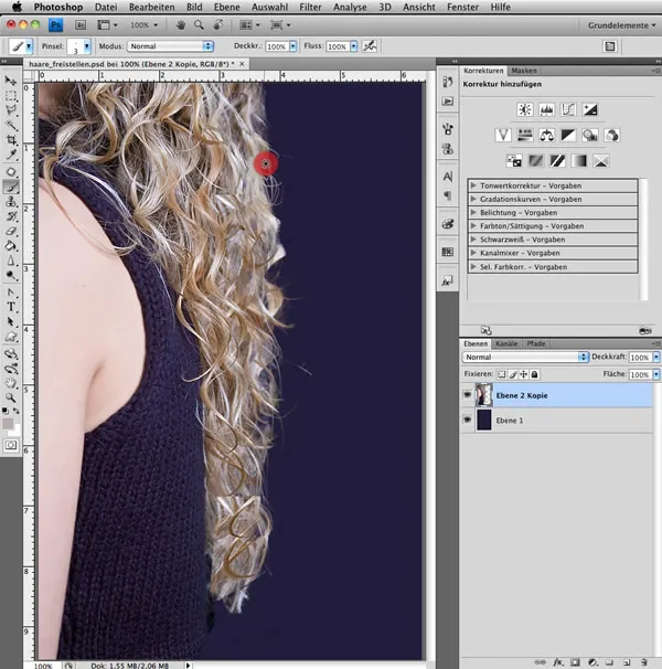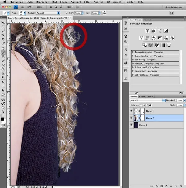Jetzt kommt ein Trick, der aus den schön freigestellten Haaren wirklich perfekt freigestellte Haare zaubert. Der Trick ist: Wir malen uns einfach ein paar feine Haare dazu!