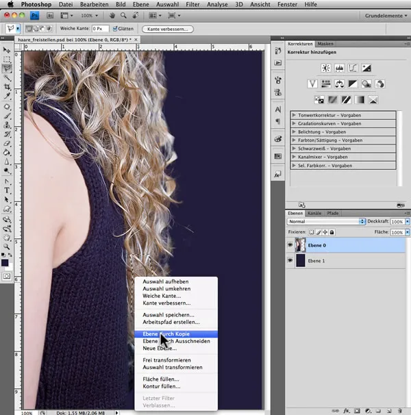 Per Rechtsklick aus der Auswahl eine neue „Ebene durch Kopie“ erstellen: