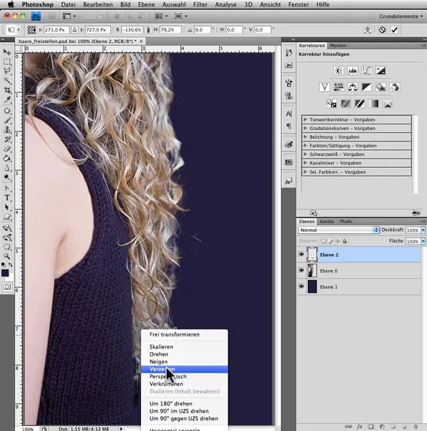 Das Haarteil nach Wunsch verzerren (Cmd/Strg + T > Rechtsklick > Verzerren):