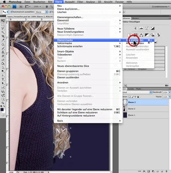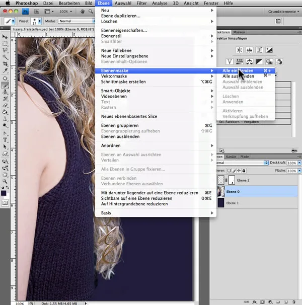 Jetzt erstellen wir aus dem Haarteil eine Ebenenmaske mit dem Status eingeblendet.