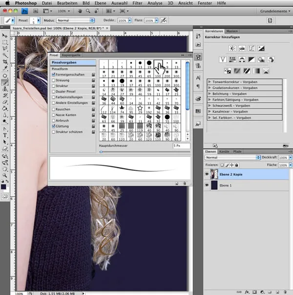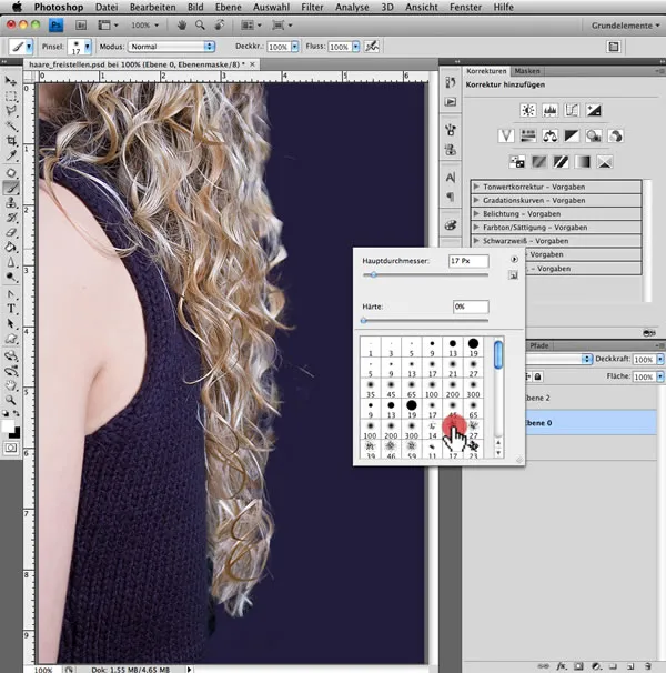 … und malen auf der weißen Maske im Ebenenmenü weiche Übergänge von unserem Haarteil zum Haar. Hier lohnt es sich mit verschiedenen Pinselstärken und -köpfen auszuprobieren.