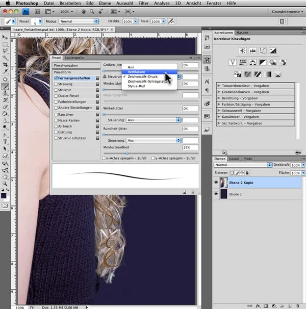 In der Auswahl „Steuerung“ nehmen wir „Verblassen“. Damit werden unsere Pinselstriche nämlich … verblassen.