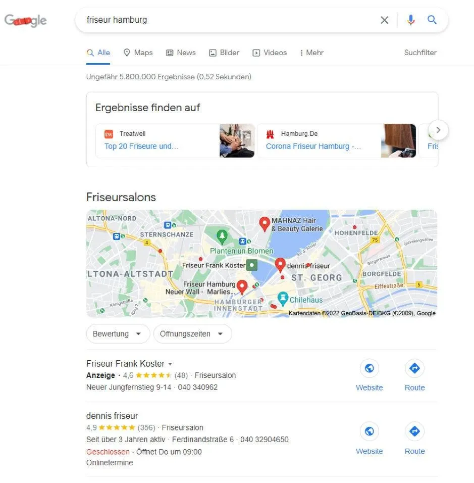 In einem anderen Fall kann ein Keyword mit einer lokalen Suchintention auch so simpel wie “friseur” sein, denn diese Suchintention impliziert ebenfalls, dass der Suchende nach Friseuren in seiner Nähe sucht.