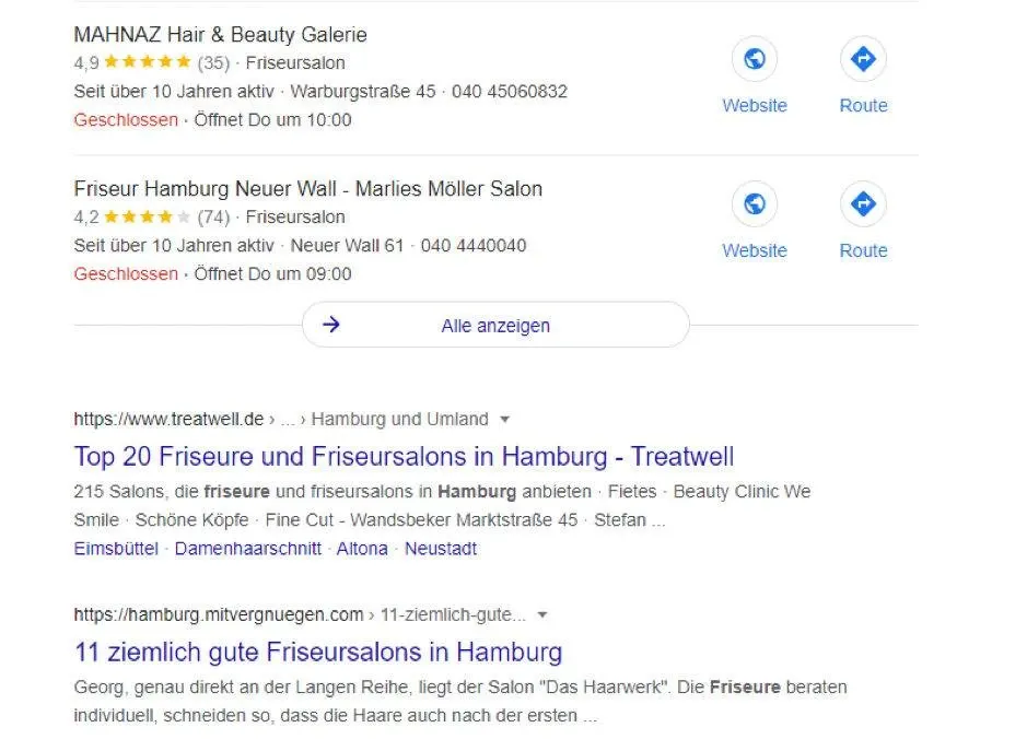 Da Google von Jahr zu Jahr fortschrittlicher wird, erkennt es, dass es sich bei dem Keyword “Friseur Hamburg” um eine Lokale Suchintention handelt und zeigt Ihnen dieses Feature oberhalb der organischen Suchergebnisse an. In diesem Bereich können Sie nicht mit einer speziellen Seite sonder lediglich mit Ihrem GoogleMyBusiness Profil ranken. Darauf gehe ich weiter unten im Abschnitt “Das Google My Business Profil als wichtigster Bestandteil der lokalen Suche” noch ein wenig genauer ein.