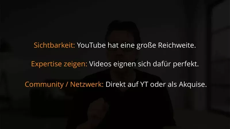 Ich nutze YouTube als Werbekanal, um Wissen zu teilen, Vertrauen aufzubauen und letztendlich Kunden zu gewinnen. Tatsächlich reicht es oft, nur eine Handvoll Views zu haben, um neue Aufträge zu generieren. Es geht nicht darum, Millionen von Aufrufen zu erzielen, sondern darum, die richtigen Menschen zu erreichen.