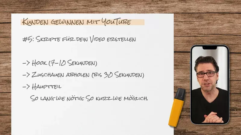 Erkläre im Skript, was die Zuschauer aus dem Video lernen sollen. Diese Informationen sollten in den ersten sieben bis zehn Sekunden des Videos vermittelt werden, da diese Zeit entscheidend ist, um die Zuschauer zu halten.