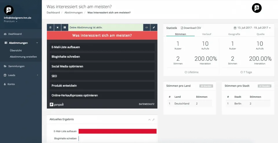 Das wichtigste Feature ist für mich Pinpoll Leads. Hier kannst du deine Umfrage mit deinen Autoresponder verknüpfen und so über deine Abstimmung nicht nur wichtige Informationen über deine Kunden bekommen, sondern auch neue Geschäftskontakte generieren. Das Beste ist daran, dass diese Kontakte perfekt segmentiert sind. Immerhin weißt du über die Umfrage bereits genau, welcher Kunde sich für was genau interessiert.