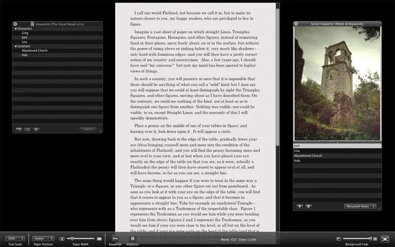 Langsam aber sicher erscheinen für Autoren und kreative Schreiber sowohl für Windows als auch für den Mac immer mehr gute Softwarelösungen. Scrivener ist sicher eines dieser Softwarepakete für den Mac. Jeder Schreiberling kennt das Problem: Man hat den Schuhkarton voller Ideen, versucht den Überblick über all seine Roman-Charaktere, Locations und Artefakte zu behalten und möchte dann noch möglichst unkompliziert alles mit einem einzigen Schreibprogramm kombinieren. Literature & Latte hat hier ein feines Projektmanager-Tool mit tollem Editor im Vollbildmodus entwickelt.
