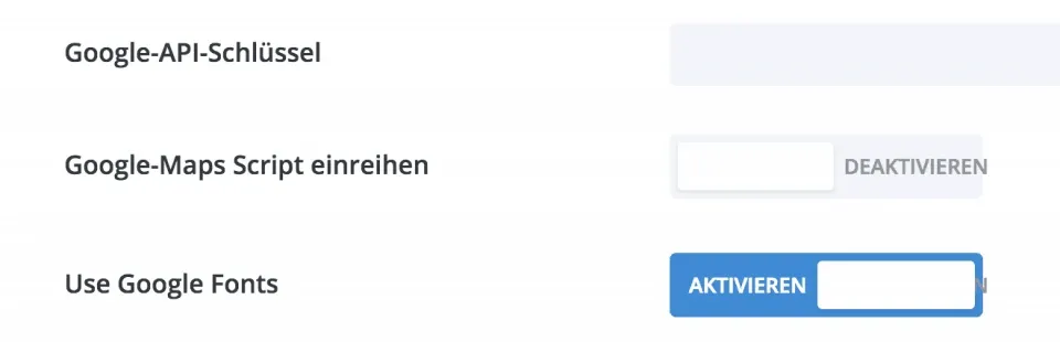 Das Theme verwendet Google Fonts, um benutzerdefinierte Schriftarten auf der Website zu verwenden. Wir erlauben auch, einen Google API-Schlüssel einzugeben, um Google Maps im Maps-Modul zu verwenden. Diese beiden Integrationen können jetzt in den Theme-Optionen deaktiviert werden.