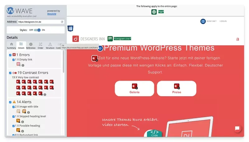 WAVE hat einen etwas anderen Ansatz. Hier geht es darum, die Zugänglichkeit zur Website zu optimieren.