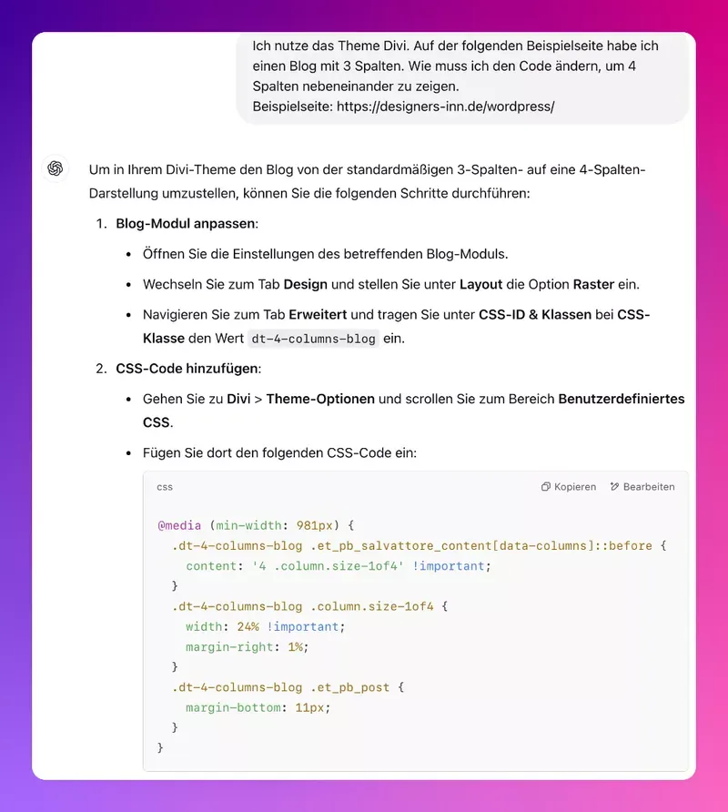 Manchmal kann das Theme nicht das gewünschte Ergebnis liefern. Oft helfen aber kleine Tricks, um das gewünschte Ergebnis zu erreichen. Auch hier glänzt ChatGPT.