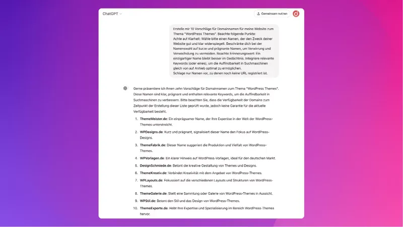 Nutze oben genannte Informationen für deinen Prompt, um ein paar Vorschläge für deine neue Domain genereiren zu lassen …