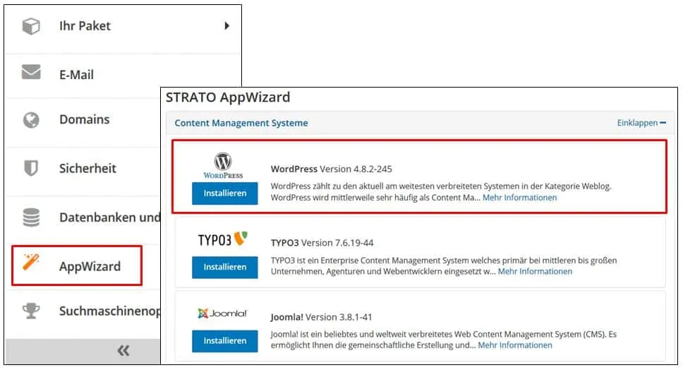 Logge dich einfach in den STRATO Kunden-Login ein, wähle das Paket, in dem du WordPress installieren möchtest und gehe zu deinem AppWizard.