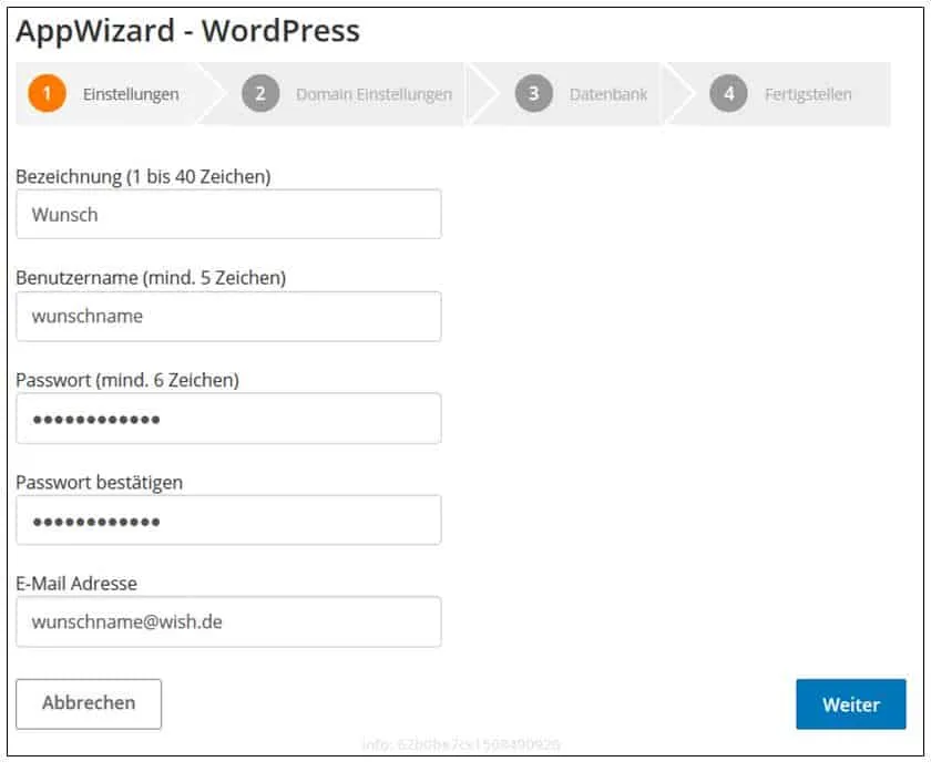 Wähle hier „WordPress Installieren“ und folge den Schritten des AppWizards. Trage folgende Informationen ein:
