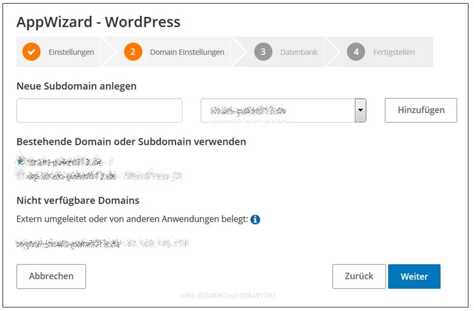Wähle „Weiter“ und im nächsten Schritt die Domain (oder die Subdomain) aus, unter welcher deine WordPress-Webseite erreichbar sein soll. Ist die gewünschte Subdomain nicht aufgelistet, trage in das Feld „Neue Subdomain anlegen“ die gewünschte Subdomain ein und wähle dann „Hinzufügen“.